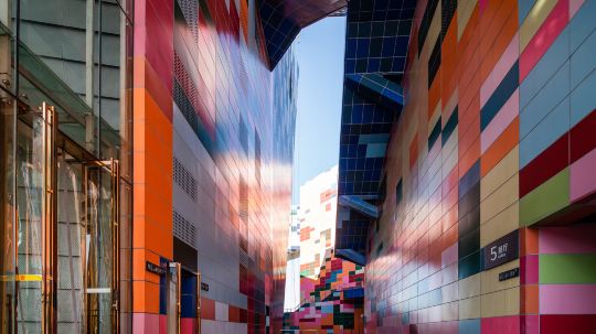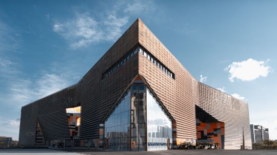 采用大面积的丹霞石和玻璃体块来塑造大堂