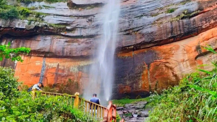 景区中知名的应该是赤水大瀑布,也被称为十丈洞瀑布,位于贵州省赤水市南部。瀑布悬挂在红色丹霞悬崖上,比黄果树瀑布还要高8米,因此来景区游玩,瀑布是必体验的。游客走过景区大门有一条岔路,一边是游客步行的路,另一边是电瓶车走的公路,可自行选择。步道的路上可以一路欣赏丹霞地貌,呼吸新鲜空气。走到底就是赤水大瀑布了,壮美的瀑布倾泻入潭水,溅起的水花晶莹剔透,发出的瀑布声轰鸣震耳,运气好的话在阳光下还能看到彩虹。攀上潭水中的巨石,就能近距离感受瀑布。地址:贵州省遵义市赤水市两河口镇