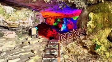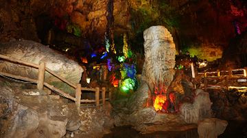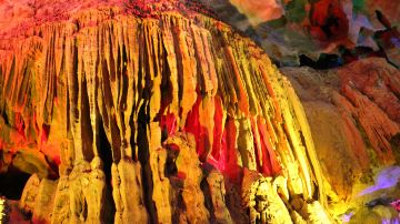 夜郎洞位于安顺市镇宁县境内,与黄果树瀑布、石头寨相邻,是世界上喀斯特地貌集中的溶洞群景区,相传夜郎王曾居住于此而得名。溶洞群由夜郎洞、石花洞、蜂子岩洞等大大小小溶洞和天坑、燕峰斜崖等独特的喀斯特地貌共同组成。夜郎洞洞口为一巨大天桥,伏流从洞中涌出。溶洞高百米,分三层。第一层为水洞,二三层为旱洞。第一层水洞蜿蜒曲折,船行其上,但见两岸岩溶形态各异,石柱、石钟乳、石笋密布,蔚为壮观。第二层旱洞由5个大庭组成,依次布满人形石钟乳和石花、石柱,灯光下交相辉映,五彩斑斓。神奇的是一丛丛怒放的石“灵芝”,枝繁叶茂,从茎部到叶尖闪闪发光,颇为奇特。第三层旱洞高大开阔,洞中石笋密密匝匝,仿佛进入了原始森林,舒适惬意。大量岩溶发育似树,树冠伸展,荫及面广,灯光下五彩斑斓,有置于天外天的感觉。地址:贵州省安顺市镇宁布依族苗族自治县扁担山乡上洞村