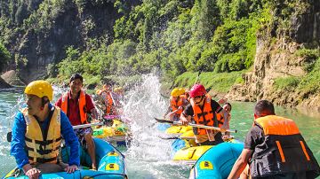 体验【秘境竹筏】斜倚竹筏,随船工撑篙的节奏缓缓漂流,此刻无需言语,只任清风拂面,感受“舟行碧波上,人在画中游”的东方意境;